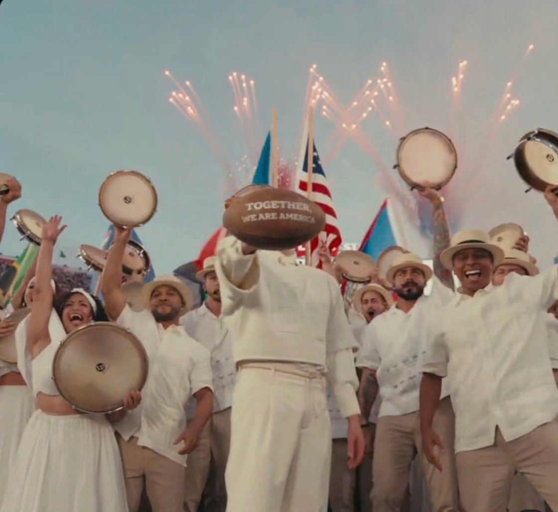 He concluded by saying "God bless America" and naming countries throughout North, South, and Latin America while dancers carried their flags across the stage, then raising a football that said “Together, We Are America”.